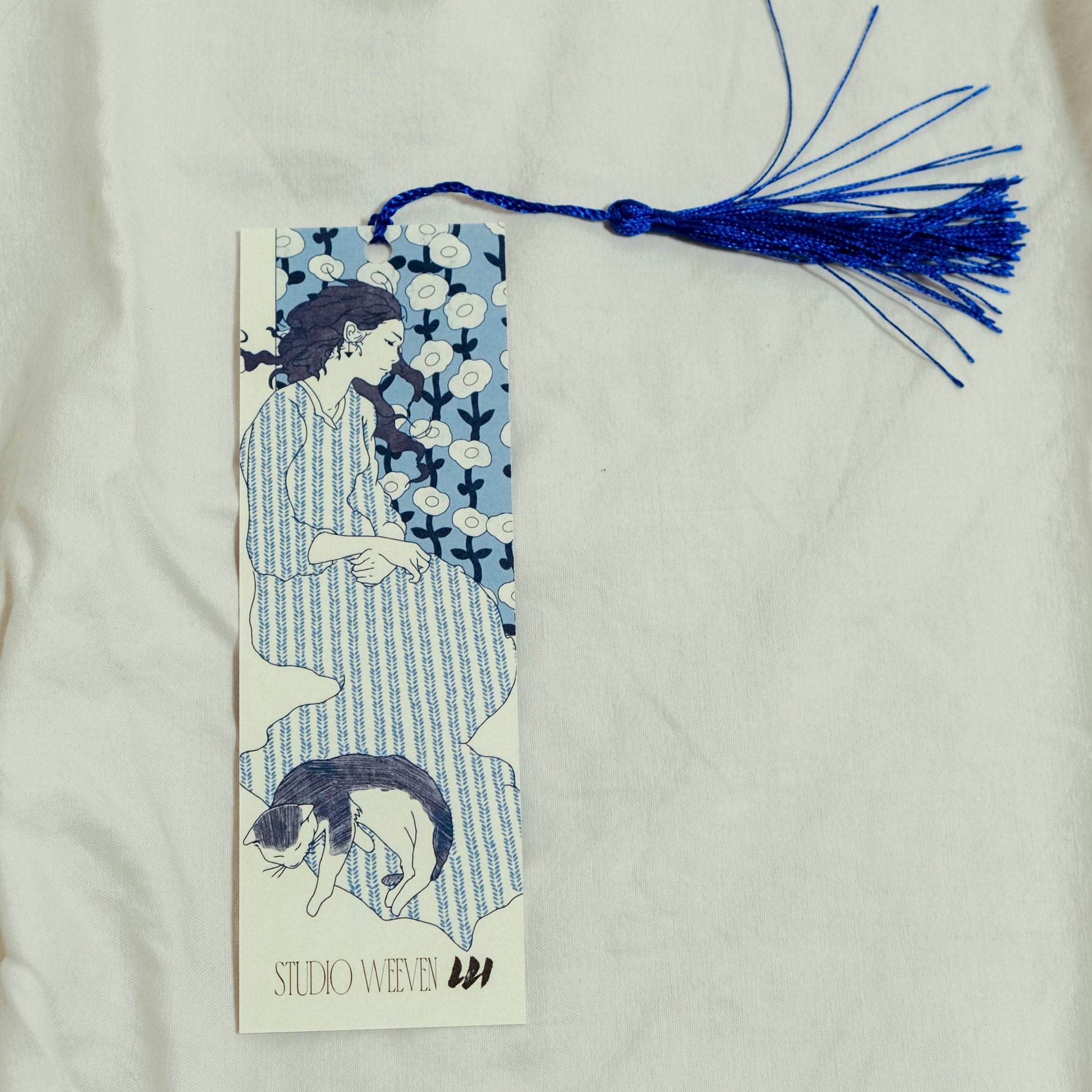 Bookmark has Man Cooking on one side and Woman and Cat on the other.